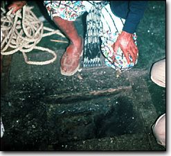The navel hole at Santiago Atitlan is only uncovered once a year at midnight prior to Holy Friday during Easter Week. Later that morning, the Atitecos lower into the hole a massive wooden cross bearing a life-size sculpture of Christ with moveable arms crucified to it with nails. | ![]()