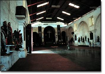 Beyond the elevated altar east of the world navel hole are three monumental altarpieces that dominate the central apse as well as the side chapels to the north and south. All three are visible from the principal entrance at the west end of the nave and are meant to be seen as a group. | ![]()
