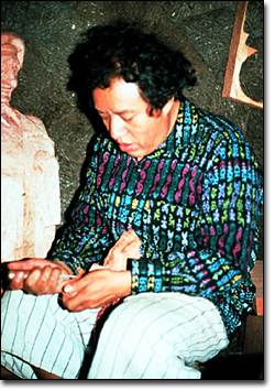 The disarticulated pieces were left in storage until 1976 when the parish priest, Father Francisco Rother, commissioned a local Maya sculptor named Diego Chavez Petzey to initiate repairs and carve replacement panels for those portions of the altarpiece which were too damaged for reuse. Diego was later joined in this project by his younger brother Nicolás Chavez Sojuel. The two brothers carried out the renovation of the altarpiece over a five year period, prematurely abandoning work with the death of Father Rother in 1981 at the hands of political assassins during the Guatemalan civil war. | ![]()