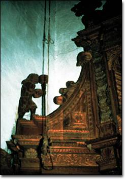 The vegetal scrolls and volutes at the extreme edges of the first tier of saints, the stylized trees flanking God the Father, and the maize plant or tree at the crest are all innovations which Diego Chavez designed to give the impression of the verdant surface of a mountain. To further emphasize the effect he added two Maya cofradía members in traditional dress climbing upward along a rocky path of decorative beads. Instituted during the early Colonial period, Atiteco cofradías are a system of religious brotherhoods independent of the Catholic Church and in many respects function in direct conflict with it by practicing elements of traditional Maya religion. | ![]()