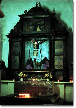 In the past few years, I've had the opportunity to work closely with both of the Chavez brothers and discuss at length their vision of the altarpieces' role in the life of the community. While describing the arrangement of the altarpieces around the altar, Nicolás pointed to a very old and smoke-stained painting on the left-most retablo which serves as the backdrop for a life-size crucifix. |