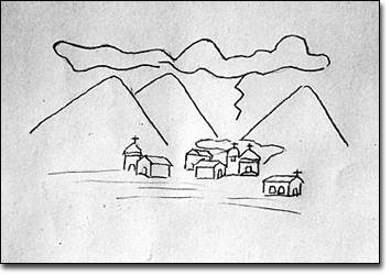 Behind the base of the cross is a crudely-drawn village representing Santiago Atitlan with the familiar façade of the church and its domed belltower. Surrounding the village are three volcanoes and the jagged shoreline of Lake Atitlan. Heavy clouds above the town emit lightning bolts. In Atiteco myth, lightning is the force that breaks open the germinating maize seed and helps it to grow out of the earth. In addition, lightning charges the earth with its life-giving power so that whatever is buried within it can rise from the dead. As such, lightning functions in a manner similar to ancient Maya theology in which it cracks open a portal into the underworld to allow the world to emerge (D. Tedlock 1996:65; Schele and Mathews 1998:410). |