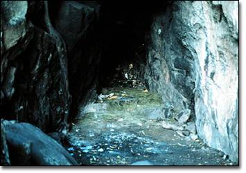Caves and shallow rocky recesses are rather common in the mountains surrounding Santiago Atitlan. Many are heavily stained with incense smoke and littered with the remains of candles, flower petals, alcohol bottles, and other ritual offerings. Caves serve as liminal places in which individuals may access the world of the spirit where ancestors and mountain deities may be approached directly. This practice follows ancient precedent. According to the Título Totonicapan, the gods of the various highland Maya lineages called on the first men to place their carved images in mountain caves before the first dawn, and that there they could be consulted (Carmack and Mondloch 1983:184). | ![]()
