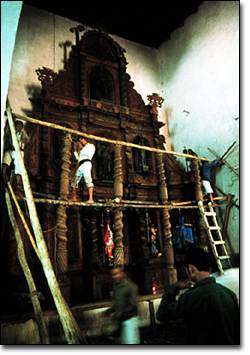 Once the church has been thoroughly swept and washed clean, a select group of Atitecos assemble to construct the huge temporary Monumento. Like the altarpiece, Nicolás Chavez said that it represents the "entryway into the home of the ancestors at Paq'alib'al." It consists of a framework of roughly-hewn horizontal wood planks supported by Colonial-era twisted columns of the same age and type used on the central altarpiece. The Atitecos then loop twisted ropes around this framework to create an immense gridwork, with a green cross or symbolic tree affixed at the top. | ![]()