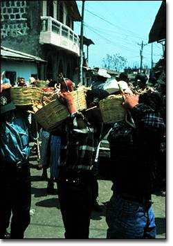 While the Mam image receives his devotions, other Atiteco elders oversee the decoration of the Monumento from which the world will be reborn. Young men in two processional columns carry baskets of ripe fruit brought specially from the coast and blessed for this purpose into the church. | ![]()