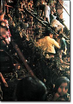 There the fruit is hung from the twisted ropes of the Monumento along with cypress boughs and scarlet bromeliad flowers. Two other long wooden frames decorated with cypress and flowers are tied to the sides of the monument to create a diagonal slope, mirroring the shape of the altarpiece behind it. The decoration of the Monumento is sufficiently heavy that it obscures the altarpiece behind it other than the summit and crestal tree, although a portal is left open at the lower center directly in front of the niche of Santiago so that the saint can be seen. As a result, the saint may conceptually have the power to come and go as he pleases. The Monumento thus represents a foliated version of the altarpiece as the home of the saints. | ![]()