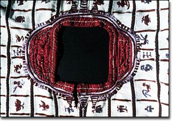 Traditional huipil from Santiago Atitlan with quatrefoil neck pattern flanked by mirrored images of three volcanoes.