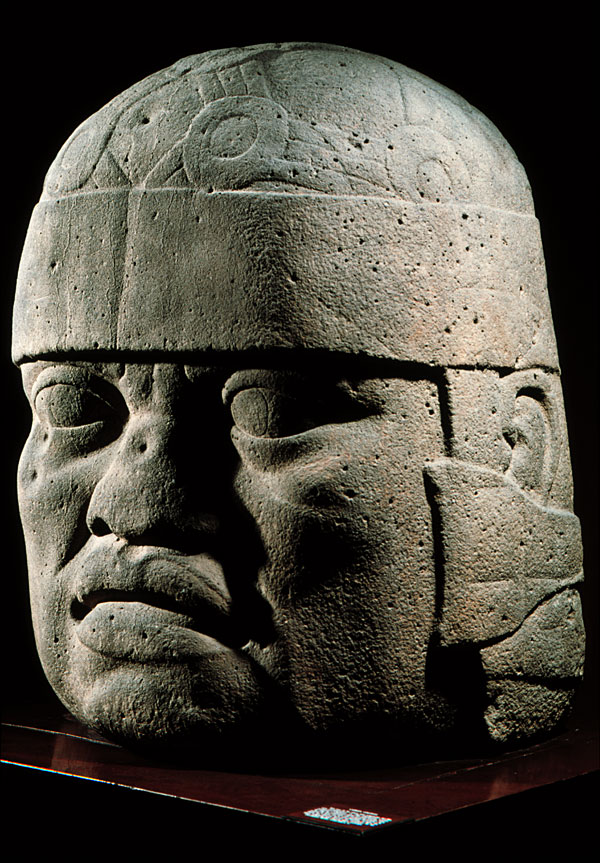 prev - home - index - next One of seventeen known colossal heads for which Olmec culture is famed, this one was found in the major Olmec site of San Lorenzo Tenochtitlan. Scholars are divided between those who think these are portraits of rulers and those who think they may be the heads of decapitated enemies or ballplayers. Colossal Head # 6 Olmec Middle Pre-Classic (1000-600 B.C.) San Lorenzo Tenochtitlan, State of Veracruz Basalt 1.67 x 1.41 m. National Museum of Anthropology, Mexico. Photo © Jorge Pérez de Lara |