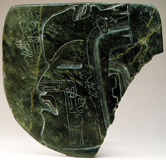 prev - home - index - next Displaying the typical Olmec cranial deformation, the main profile's head turns into a second face in profile, both displaying the down-turned were-jaguar snarl and clefted forehead. Three more total and partial profiles have been etched, both inside the countour of the principal face and outside of it. Plaque with 5 bas-relief and etched profiles Olmec Middle Pre-Classic (800-400 B.C.) Unknown Dark greenstone 15.5 x 16.4 cm. National Museum of Anthropology, Mexico. Photo © Jorge Pérez de Lara |