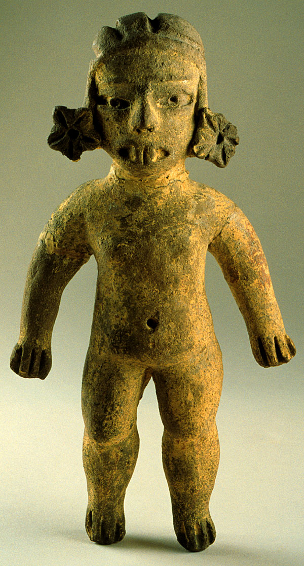 prev - home - index - next Noteworthy in this figurine are its beautiful, flower-shaped earflares. Nudity, so common in these figurines, has led some authors to speculate about a possible association with fertility rites, while others have advanced the possibility that they were probably clad with miniature items of clothing. Female figurine with flower earflares Central Mexican Pre-Classic Middle Pre-Classic (800-400 B.C.) Tlatizapán, State of Morelos Clay with abundant yellow pigment 19.7 x 11 cm. National Museum of Anthropology, Mexico. Photo © Jorge Pérez de Lara |