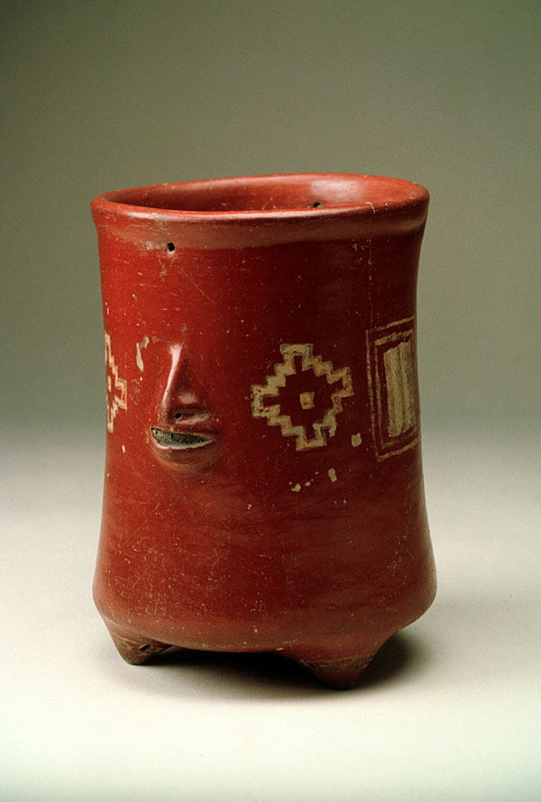 This beautifully preserved vase shows some of the common geometrical motifs used by West Mexican artists. The vase's rim has been perforated on opposite sides, suggesting it may have been carried or hung through the use of some kind of cord. The piece is unusual, however, in that a human face appears to be emerging from within the vase: note the realistic, full-dimensional rendering of a human nose and mouth.
