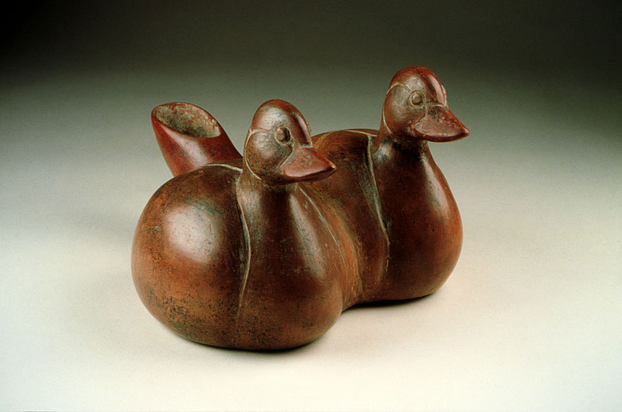 This beautiful sculpture of a pair of ducks may have been inspired by direct observation of nature, as many species of ducks that would have lived in the lake environment of West Mexico are monogamous. Notice the spout behind the ducks' bodies, which would have served to pour liquid into and out of this imaginatively conceived double-chambered vessel.