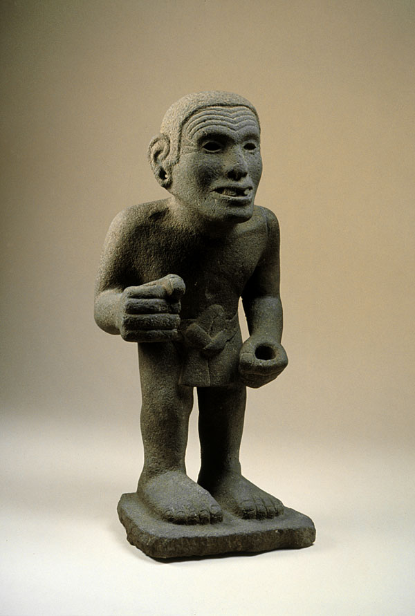 Sculpture in the round all but disappeared in Mesoamerica with the passing of the Olmec. Vigorous Mexica artistry revived this type of sculpture almost 1,700 years later and was responsible for some of Mesoamerica's all-time masterpieces. This representation of a standing old man may have been used as a standard bearer, given the fact that the figure's hands were sculpted as if to hold some kind of staff.
