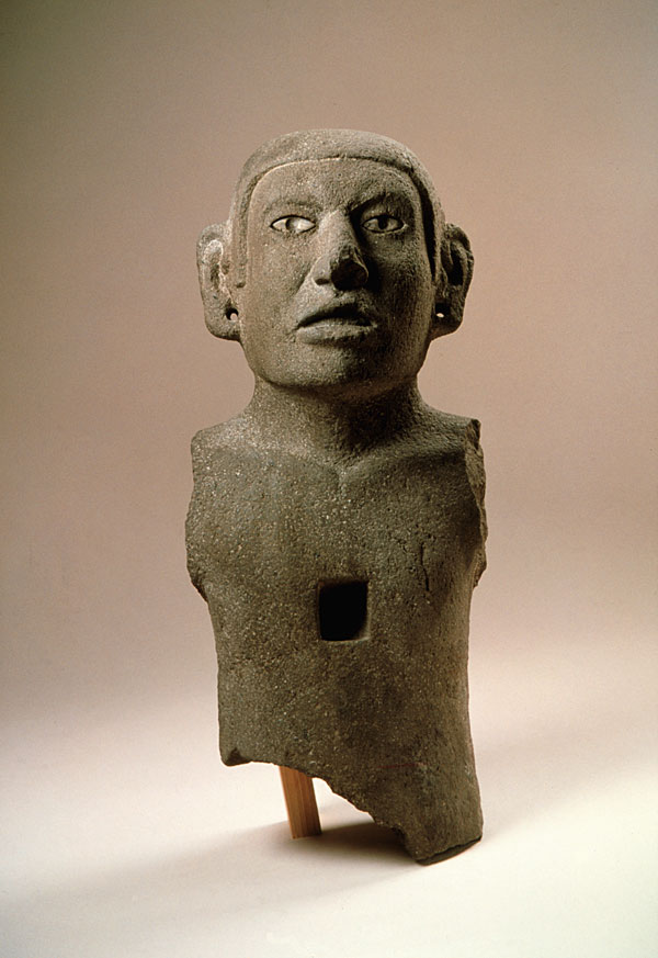 Even though fragmentary, this piece still bespeaks the full command of their art Mexica sculptors had. Notice the sensuous carving of the shoulder bones, the shell inlays for the eyes and the strong realism of this character's expression. The square peghole in the chest suggests that a tenon for supporting something may have once been inserted into this remarkable figure's torso.