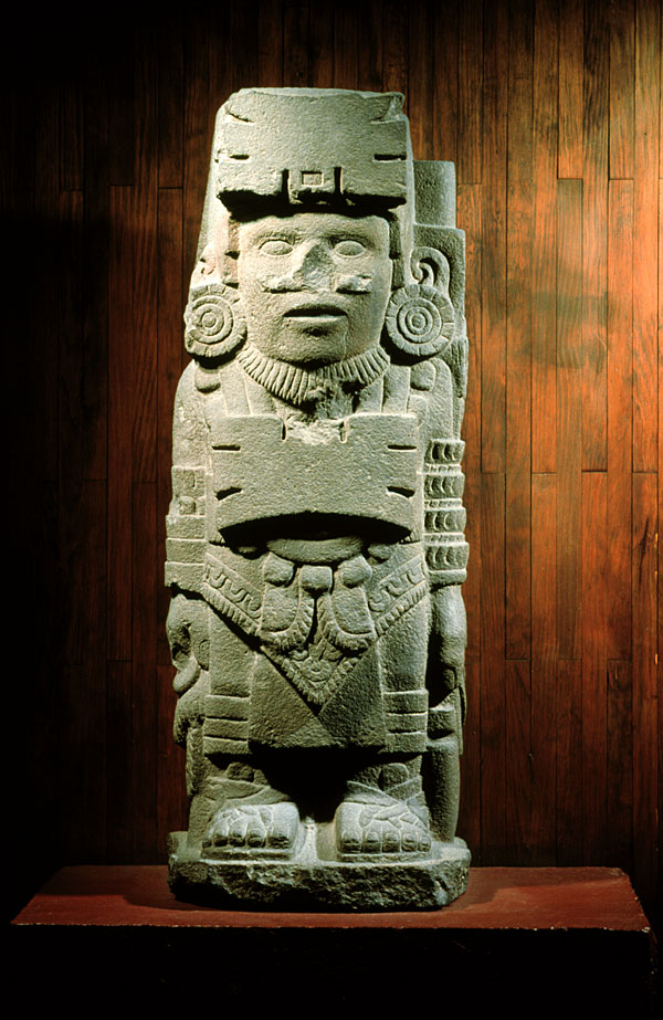 Sculpture of a standing warrior Mexica (Aztec) Late Post-Classic period (1319-1521 A.D.) Valley of Mexico Volcanic stone N/A National Museum of Anthropology, Mexico. Photo © Jorge Pérez de Lara |