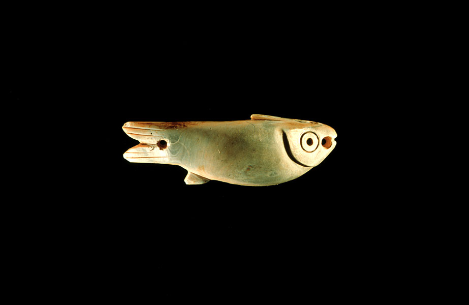 Another naturalistic rendering of a fish. It has been proposed that individual fish "beads" were strung to form fish necklaces. Often, water-associated imagery is used as a reference to the Underworld, which was conceived of as a watery place. It could also be that the reference was less oblique, given the importance of water for agricultural societies.