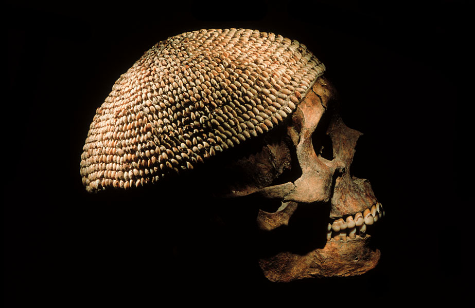 Skull cap Nayar Middle Classic period (450-750 A.D.) Huiztle, State of Jalisco 2,155 fresh water small snail shells and thread (original no longer existent) 18.5 cm. (diameter) National Museum of Anthropology, Mexico. Photo © Jorge Pérez de Lara |