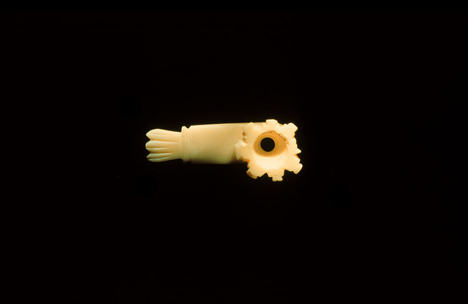 Although only one of a pair has been found, this example of an ear ornament is particularly interesting in that it is carved in a complex, flower-like shape, while the stem has also been worked to resemble hanging beads or feathers.