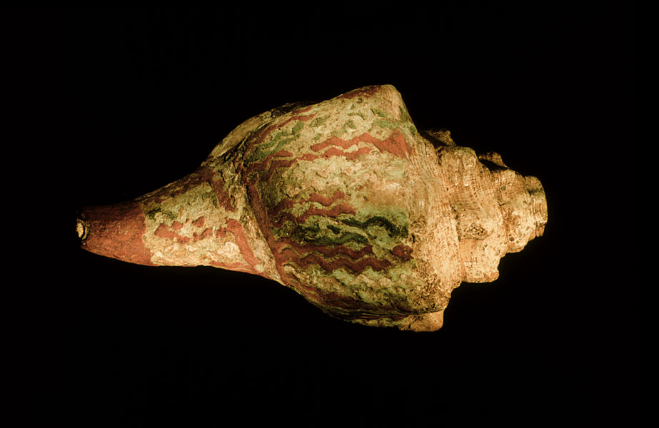 Painted with mostly red and green pigments, using a technique known as "pseudo-cloisonné", this kind of highly ornamented conch trumpet must have been used in connection with ritual occasions, possibly even during the rites pertaining to an interment.