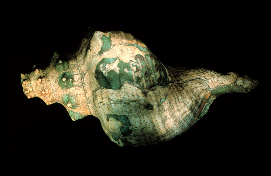 Painted conch trumpet Teotihuacan Early to Middle Classic periods (200-650 A.D.) Teotihuacan, State of Mexico Conch 45 cm. National Museum of Anthropology, Mexico. Photo © Jorge Pérez de Lara |
