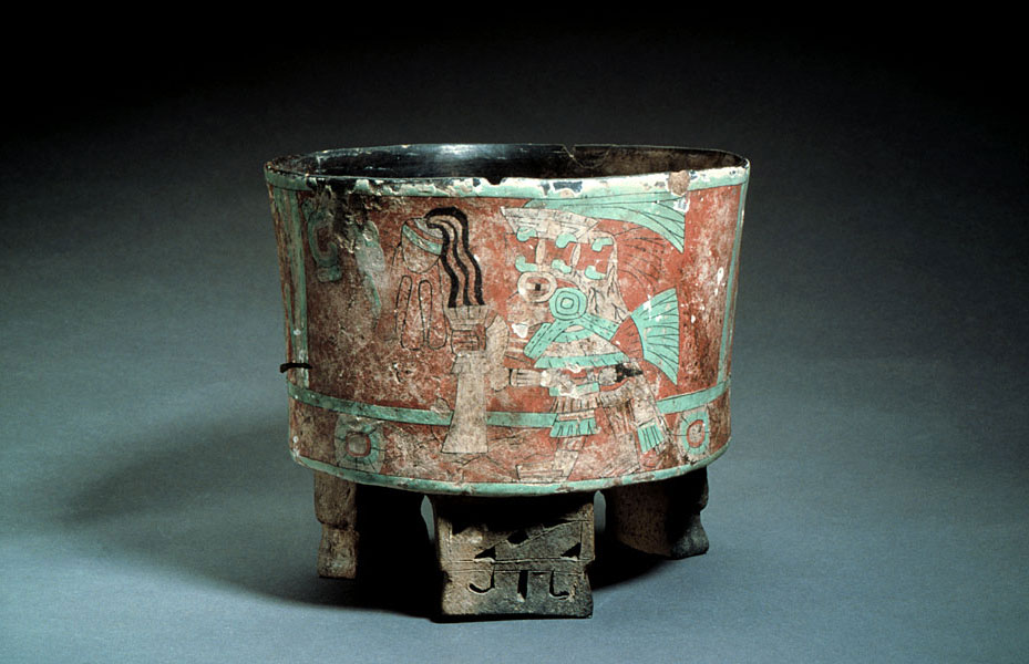 prev - home - index - next Tripod vessels are diagnostic of Teotihuacan culture or influence. The color palette on this particular one is also typically Teotihuacano. The scene depicted appears to be war- and/or water-related. Tripod vessel Teotihuacan Early Classic (300-550 A.D.) Teotihuacan, State of Mexico Stone with applied painted stucco 15 x 16.3 cm. National Museum of Anthropology, Mexico. Photo © Jorge Pérez de Lara |