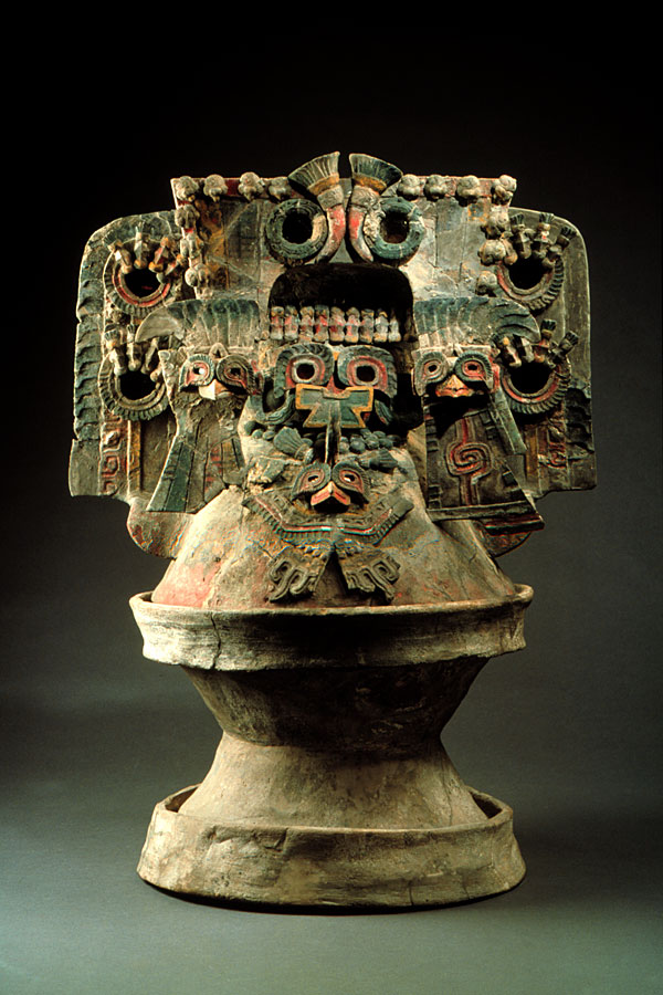 prev - home - index - next This kind of composite brazier was very common in Teotihuacan, where workshops have been found in which the different parts and components of this kind of brazier were manufactured in great quantities, presumably to be sold for later assembly. Lidded brazier Teotihuacan Early Classic (300-550 A.D.) Teotihuacan, State of Mexico Clay, mica and yellow, red and blue-green pigments 59 x 92 cm. National Museum of Anthropology, Mexico. Photo © Jorge Pérez de Lara |