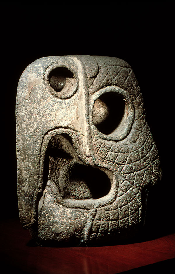 prev - home - index - next This piece was found in one of Xochicalco's many ballcourts. The association of macaws and ballcourts is also documented for Tula and, most famously, with the Maya site of Copán. They have been described as ballgame markers, but their true use remains unknown. Macaw head Xochicalco Late Classic (600-900 A.D.) Xochicalco, State of Morelos Stone 56.5 x 38 cm. National Museum of Anthropology, Mexico. Photo © Jorge Pérez de Lara |