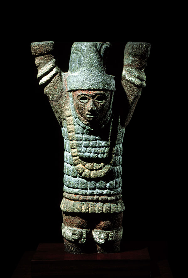 prev - home - index - next This figure was one of several, mutually distinct, bench or throne supports. Popularly known as "Atlantito" (little Atlas) because of his supporting stance, this figure wears padded cotton armor, a necklace, knee protections and a feather headdress. Anthropomorphic bench support Toltec Early Post-Classic (900-1250 A.D.) Tula, State of Hidalgo Volcanic tuff with red, yellow, blue and white pigments. 73 x 41 cm. National Museum of Anthropology, Mexico. Photo © Jorge Pérez de Lara |