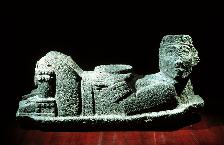 prev - home - index - next This enigmatic type of sculptural depiction became very extended in the Post-Classic Period. Examples of it have been found from the Yucatan all the way up to Tula, in the Central Highland modern-day State of Hidalgo. The "Chac Mool" name for this kind of figure is baseless. Reclining figure with plate on abdomen Toltec Early Post-Classic (900-1250 A.D.) State of Tlaxcala Stone 66 x 141 cm. National Museum of Anthropology, Mexico. Photo © Jorge Pérez de Lara |