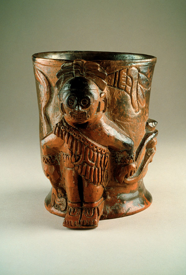 prev - home - index - next This anthropomorphic vessel is an excellent example of plumbate ware, so called because of its burnished finish the color of lead. The character's face wears round goggles that might tie him to the Rain/War god known as Tláloc among later cultures. Effigy vase Toltec Early Post-Classic (900-1250 A.D.) Tula, State of Hidalgo Clay with a special burnishing treatment 18.6 x 17.6 cm. National Museum of Anthropology, Mexico. Photo © Jorge Pérez de Lara |