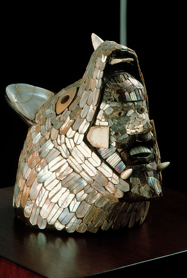 prev - home - index - next A stunning example of Toltec artistry, this is probably a depiction of a warrior wearing a helmet in the shape of a coyote, which could have marked him as a warrior of the coyote order. Among the Mexica, there were eagle and tiger (ocelote or jaguar) warrior orders. Face emerging from a coyote's maw Toltec Early Post-Classic (900-1250 A.D.) Tula, State of Hidalgo Gray clay, shell and bone. 13.5 x 9 cm. National Museum of Anthropology, Mexico. Photo © Jorge Pérez de Lara |