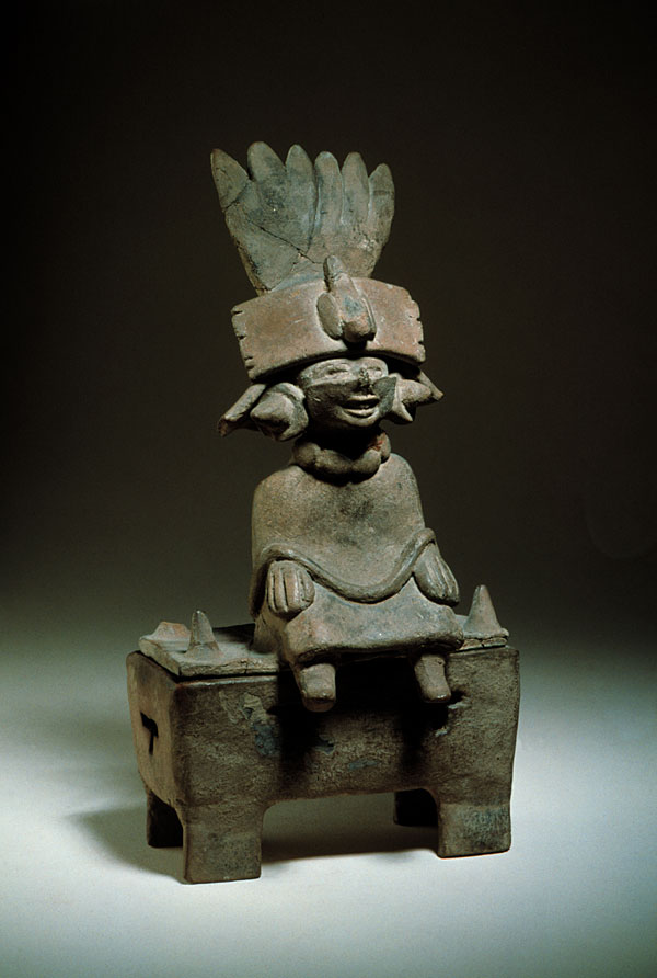prev - home - index - next Remojadas style figurines are characterized by relaxed stances and smiling faces. This particular figurine must have depicted a high-status female, since she wears a feathered headdress ornamented with a bird, huge conic earflares, a stone necklace and what probably was a formal quezquémitl or overblouse. Female figurine sitting on a coffer-like object Central Veracruz Middle to Late Classic (500-900 A.D.) Remojadas, State of Veracruz Clay with traces of white stucco 25 x 13 cm. National Museum of Anthropology, Mexico. Photo © Jorge Pérez de Lara |