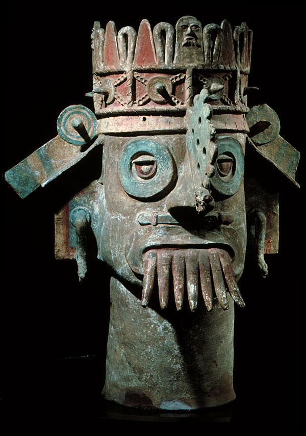 prev - home - index - next This enormous terracotta brazier depicts a deity with the characteristic round goggles and protruding mouthpiece that appear so frequently in Teotihuacan and later became associated with Tláloc, a widespread Rain/War god in Post-Classic Mesoamerica. Deity brazier Central Veracruz Unknown Unknown Clay with abundant remains of white, red, blue and yellow pigments 1.50 x 1.10 m. National Museum of Anthropology, Mexico. Photo © Jorge Pérez de Lara |