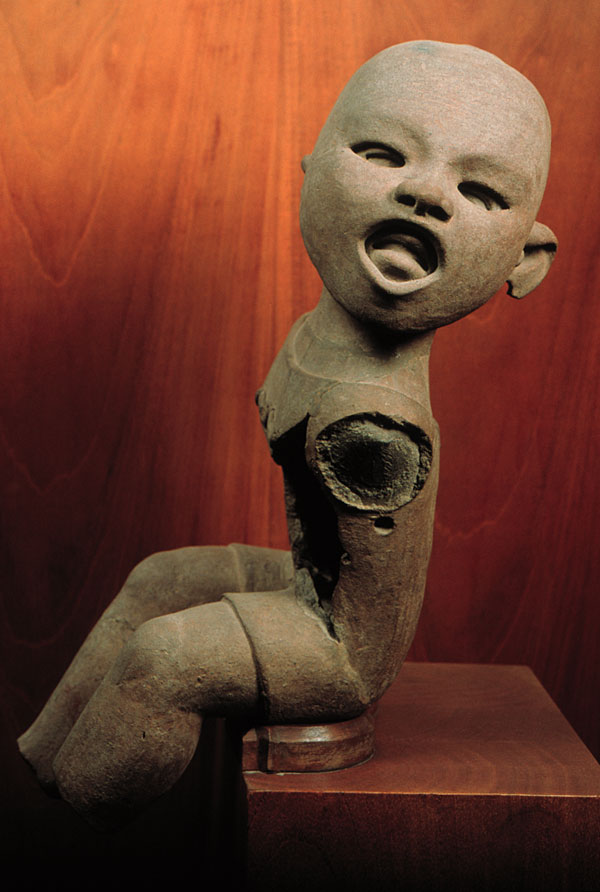prev - home - index - next This figurine depicts a person wearing a human face as if it were a mask (note the mouth and the eyelids of the wearer under the mouth and eyelids of the skin "mask"), in what is probably a depiction of the deity later known as Xipe-Tótec (our Lord the Flayed One), which was associated with Spring and renewal. Figurine of Xipe-Tótec Central Veracruz Unknown Unknown Clay 39 x 15 cm. National Museum of Anthropology, Mexico. Photo © Jorge Pérez de Lara |