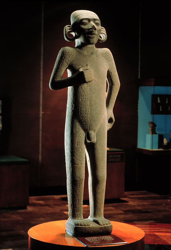 prev - home - index - next Commonly known as the "Tamuín Adolescent", this sculpture depicts a nude young male, his skin covered with complex paintings or tattoos. (Continued on next page.) Sculpture of a youth (front) Huastec Post-Classic (900-1521 A.D.) Tamuín, State of San Luis Potosí Stone 117 x 40 cm. National Museum of Anthropology, Mexico. Photo © Jorge Pérez de Lara |