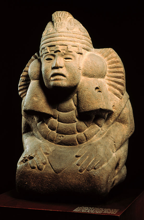 prev - home - index - next This is either the corn goddess known as Xilonen by the Mexica or a human female impersonating her. In Mesoamerican belief, impersonating meant more than adotpting the garb of deities: it implied an actual transformation into the deity, not unlike the Christian belief in transubstantiation regarding the host and consecration wine. Notice the heavy stone necklaces, the large ear ornaments and the corn cob-adorned headdress. Sculpture of a seated female Huastec Late Post-Classic (1325-1521 A.D.) Tuxpan, State of Veracruz Sandstone 83 x 49.5 cm. National Museum of Anthropology, Mexico. Photo © Jorge Pérez de Lara |
