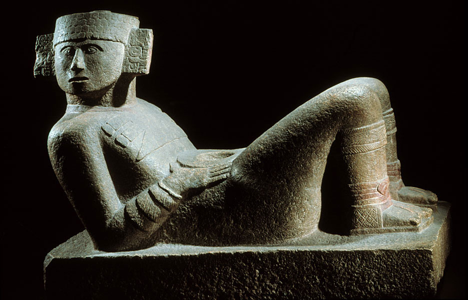 prev - home - index - next This kind of figure can be found over a large geographical area and over a very long historical period, from the Early Post-Classic down to Aztec times. The popular name for this kind of sculpture ("Chac Mool"), though, was rather fancifully coined in the XIX Century by the French explorer Le Plongeon. This is one of the finest examples anywhere of this kind of figure. Reclining figure with plate on abdomen Maya Early Post-Classic (900-1250 A.D.) Chich'en Itzá, State of Yucatán Sandstone 1.09 x 1.48 m. National Museum of Anthropology, Mexico. Photo © Jorge Pérez de Lara |