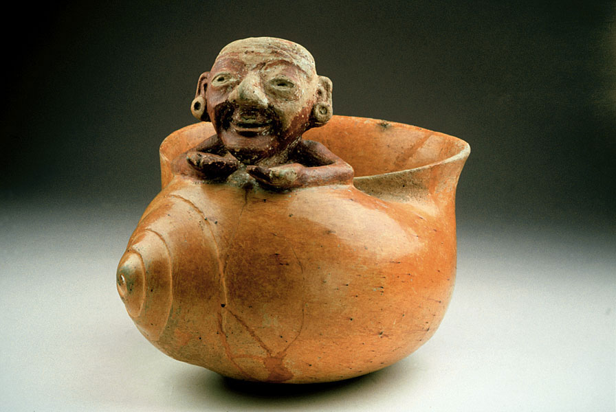 prev - home - index - next Although popular belief maintains the identification of characters emerging from flowers, shells, etc. as aluxes or trickster spirits in Yucatec folklore, old characters emerging from different kinds of shells are often most likely the deity known to scholars as God N, a quadripartite Earth-bearing entity, associated with the four cardinal directions. Vessel in the shape of an old man emerging from a snail shell Maya Late Classic (600-900 A.D.) Unknown Burnished and painted clay 18 x 15 cm. National Museum of Anthropology, Mexico. Photo © Jorge Pérez de Lara |