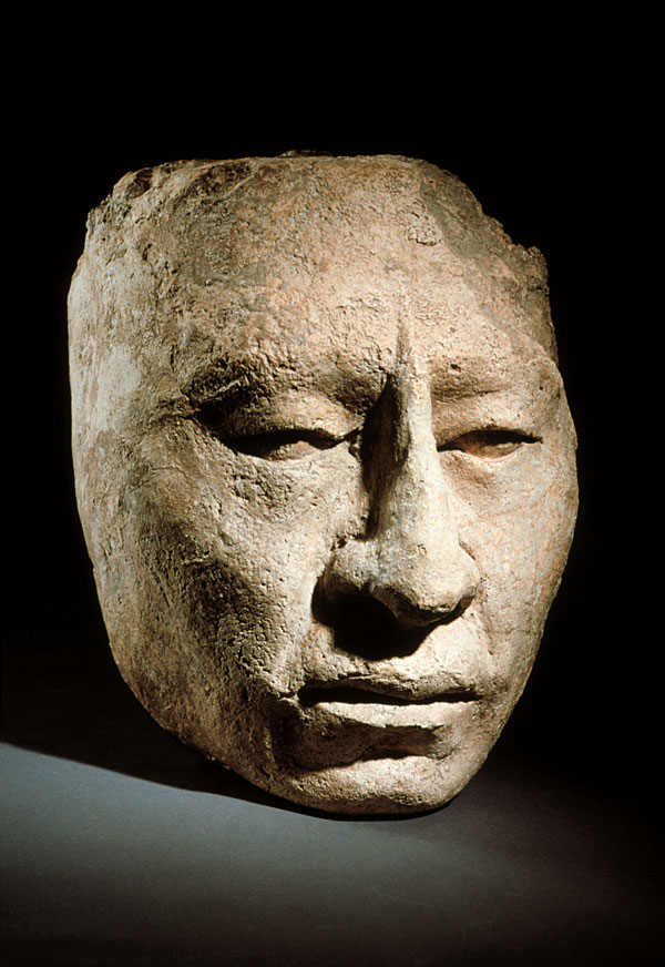 prev - home - index - next Stucco modeling attained an impressive level of perfection among Maya sculptors, and nowhere is this more apparent than in the ancient city of Palenque, where stucco seems to have been the preferred medium for the manufacture of monuments. This magnificently rendered head, with its fleshy volumes and calm expressiveness is one of many masterpieces from that site. Stucco head Maya Late Classic (600-900 A.D.) Palenque, State of Chiapas Stucco 28 x 21 cm. National Museum of Anthropology, Mexico. Photo © Jorge Pérez de Lara |