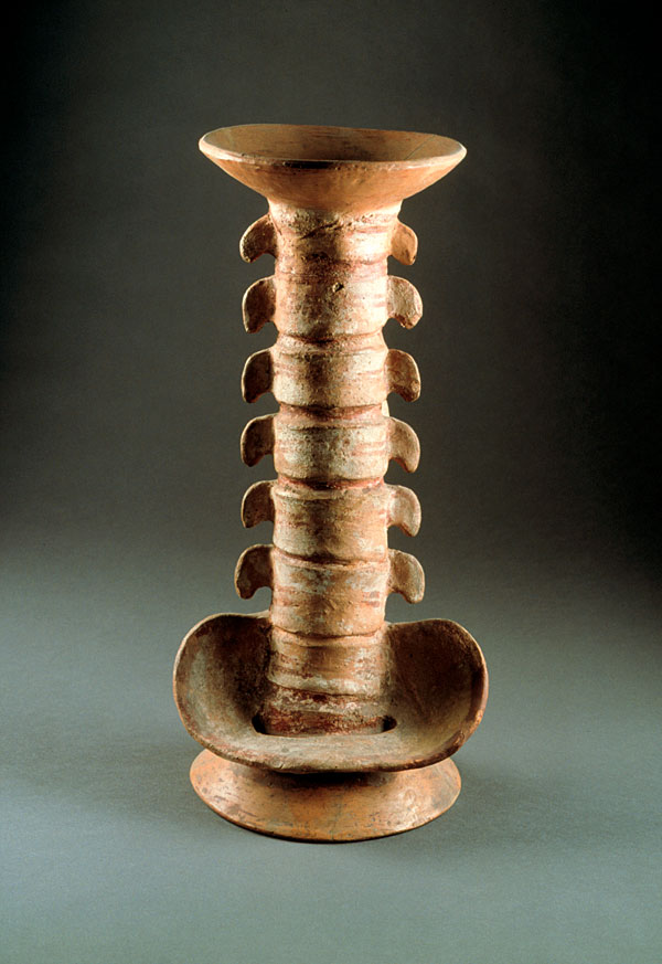 prev - home - index - next This unique piece probably served as a support for other objects. It is remarkable not only in its state of preservation, but particularly in its anatomical accuracy. Support in the shape of a human vertebral column Zapotec Late Pre-Classic (200 B.C. - 100 A.D.) Monte Albán, State of Oaxaca Clay with orange, red and white pigments 43 x 15 cm. National Museum of Anthropology, Mexico. Photo © Jorge Pérez de Lara |