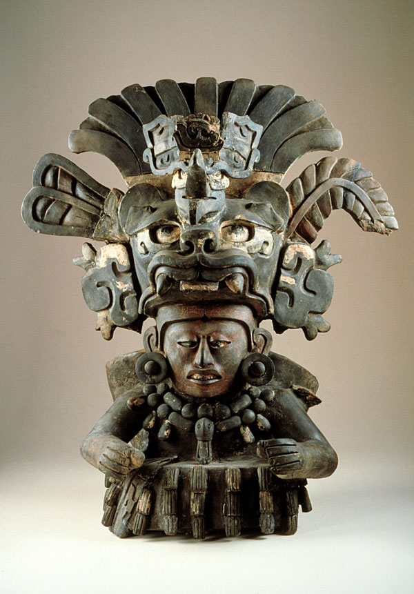 prev - home - index - next The character's realistically rendered facial features are but the beginning of what is remarkable in this piece: the great composite jaguar headdress, complete with feather panache, bird elements and giant shell earflares; the heavy stone necklace with duck's head pectoral, and the voluminous element that surrounds his lower chest, which may have been a ball-playing protective implement. Urn of a character with a jaguar headdress Zapotec Late Classic (500-800 A.D.) Unknown Dark clay with various pigments 47 x 39.7 cm. National Museum of Anthropology, Mexico. Photo © Jorge Pérez de Lara |