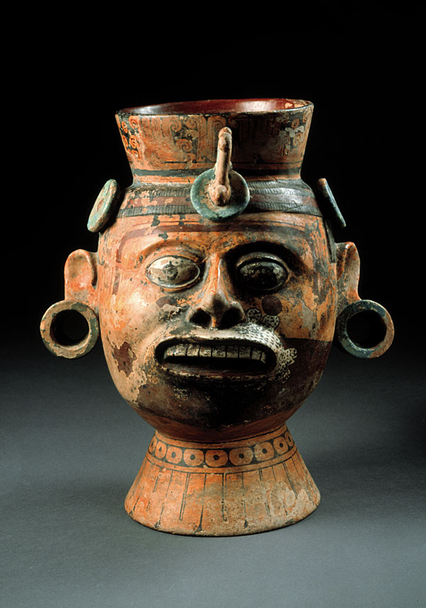 This very elaborate vessel in the shape of an anthropomorphic head has been interpreted as the Mixtec equivalent of the Mexica deity Xochipilli-Macuilxóchitl, the patron of flowers.