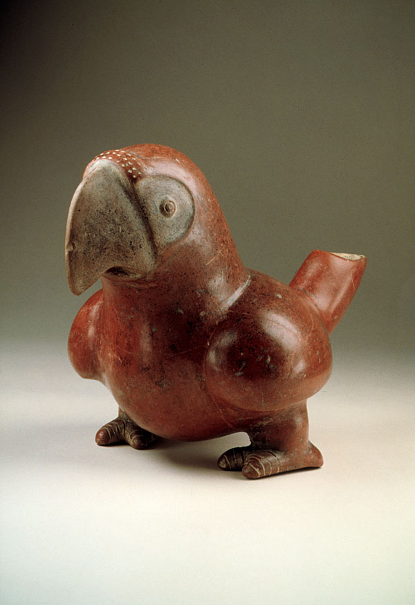 Among the remarkably graceful vessels once originally buried in the shaft tombs for which West Mexico is known, representations of animals are some of the most charming. This very realistic effigy of a parrot is a magnificent example of the mastery West Mexican sculptors attained in portraying the fauna with which they came in contact.