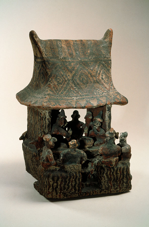 The West Mexican tradition from Nayarit is especially important for its miniature renderings of complex, collective scenes, from meetings in a square to ballgames in progress to little-understood rituals. The scene depicted here has been interpreted as a family scene, but given the fact that the attendants are all males, it is more likely that it depicts a formal meeting or some sort of ritual communion.