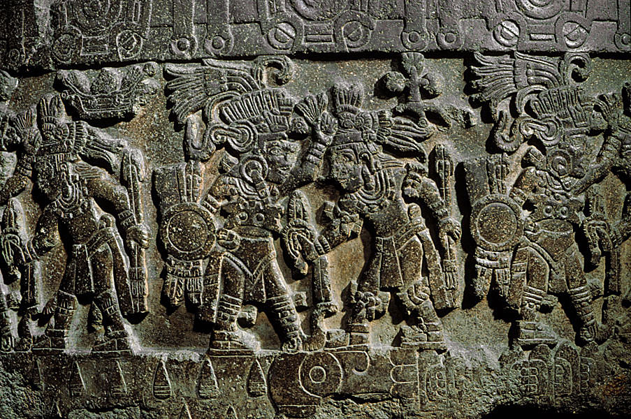 The scenes carved around the outer surface of this huge drum-shaped stone memorialize the conquests of fifteen different peoples by the Mexica, led by the tlatoani Tízoc. Grabbing an enemy by the hair was used all over Mesoamerica for centuries to denote capture. Capture (and subsequent sacrifice) was the goal of Mesoamerican warfare and not the slaughter of the enemy in the battlefield.