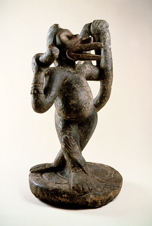 This dancing monkey with a prominent belly (the popular name for this piece is "the Pregnant Monkey") is one of the well-known evocations of Quetzalcóatl as Ehécatl, the wind deity. The strange, beaklike mouthpiece is the implement with which Ehécatl created wind, and it is one of his diagnostic features.