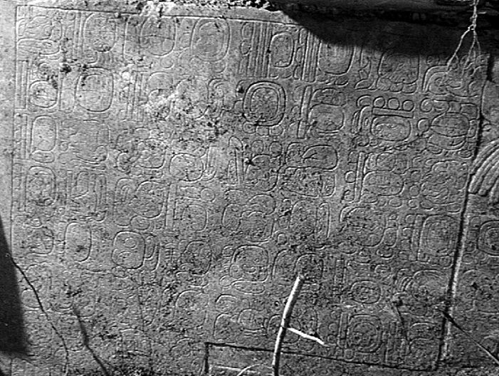 Detail of the hieroglyphic inscription on the south tablet of the bench. The text begins in mythological time with a date of (12.8.19.14.5) 1 Chik'chan 18 Ch'en (May 10, 3310 B.C.).