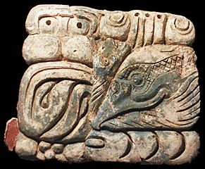 Glyph block found in the rubble in front of an interior jamb of Structure XIX, depicting a bird, probably a heron. No other examples of this glyph are known in the corpus of Maya hieroglyphs.