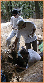 Damien Marken and Kirk Straight assist Christopher Powell in the excavation of the stucco panel and hieroglyphs from Temple XIX.