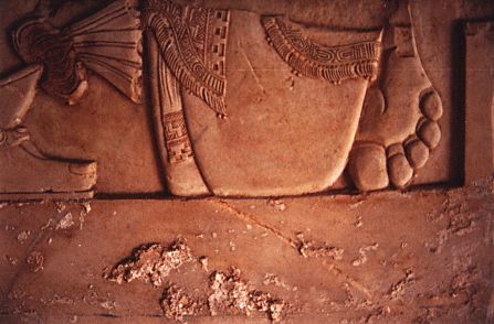 | The knees, feet and thighs of two kneeling, barefoot figures are shown at either end of the standing figure. The two kneeling figures are wearing elaborately embroidered and beaded loincloths very similar to the loincloth worn by the central figure of the stucco panel. The pattern on the loincloth of the left figure depicts a Pop symbol and Ik signs at the border of the garment, while the loincloth of the right figure displays two Ik symbols and has what is apparently a stylized sky band at the border, very similar to the border of the loincloth worn by the central figure of the stucco panel. |